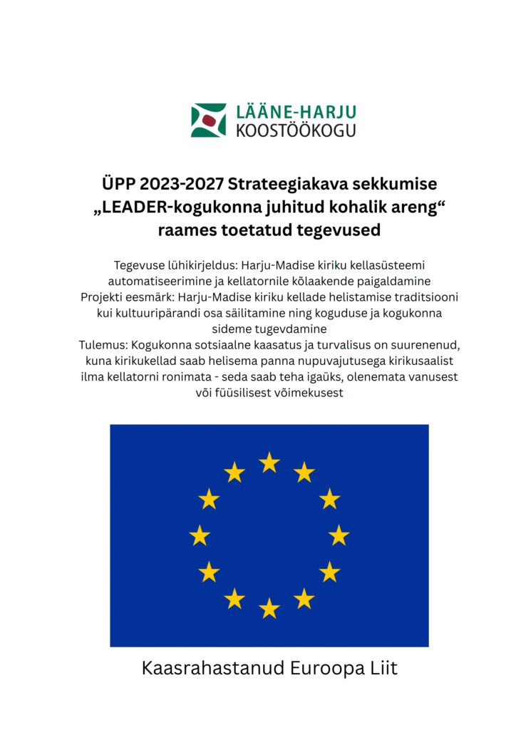EELK Harju-Madise kogudusel on hea meel teavitada, et Madise kirikus on paigaldatud uued kirikukellade automaatikaseadmed. Töö on tehtud Euroopa Liidu toetusel, ÜPP 2023-2027 Strateegiakava sekkumise „LEADER-kogukonna juhitud kohalik areng“ raames.